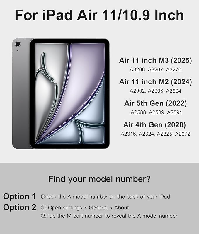 Compatibilidad: Con iPad Air de 11 pulgadas (M3) 2025 (A3266/A3267/A3270), iPad Air de 11 pulgadas (M2) 2024 (A2902/AA2903/A2904), Air 5ª generación 2022 (A2588/A2588/A2588) 9/A259 1), Air 4ª generación 2020 (A2316/A2324/A2325/A2072), esta funda ofrece recortes precisos para todos los puertos, botones y cámaras, acceso sin problemas a todas las funciones sin quitarla.